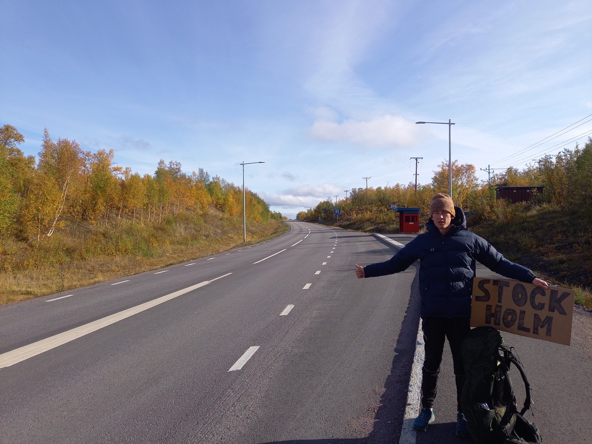 Další den v poledne pak začala naše stopovací odysea zpátky do Falunu/Uppsaly. Nejdřív bylo v plánu to jen zkusit a pak dojet vlakem, ale šlo to hezky a další den odpo jsme najednou byli doma. Dohromady to vyšlo jen na 5 aut a jeden autobus (fakt nám zastavil a vzal nás asi 150km do Skellefteå, nekecám). Trvalo to 28 hodin a ujeli jsme 1300 kilometrů po silnicích E10 a E4. Uff, pochopil jsem, že Švédsko je fakt hooodně velká země.
