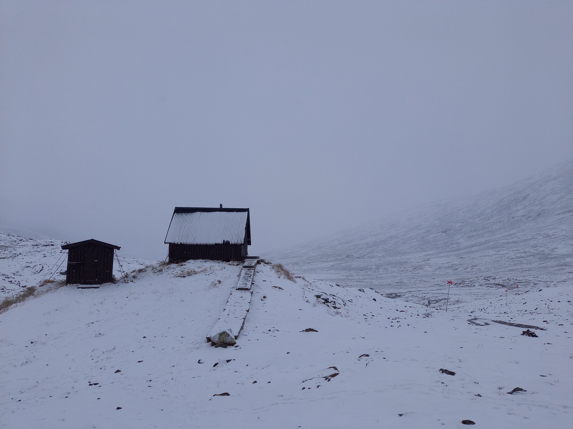 Počasí nám vyšlo krásně. Skoro nepršelo, často svítilo sluníčko a jeden den napadl sníh. Neměli jsme stan, takže jsme většinou hledali nějaký přístřešek (různý dřevěný boudy a chatky) a jednu noc jsme spali na horské chatě STF Alesjaure.