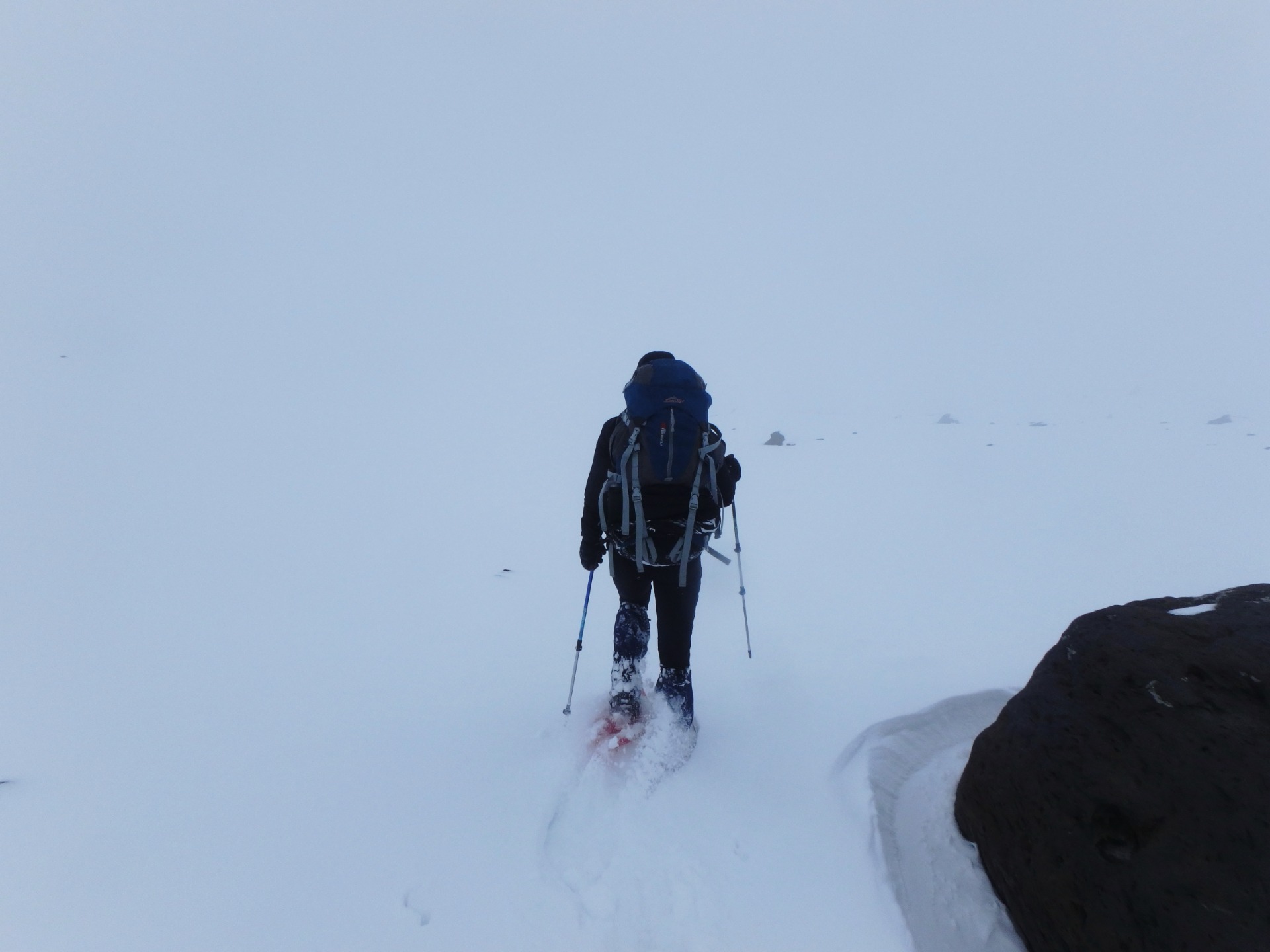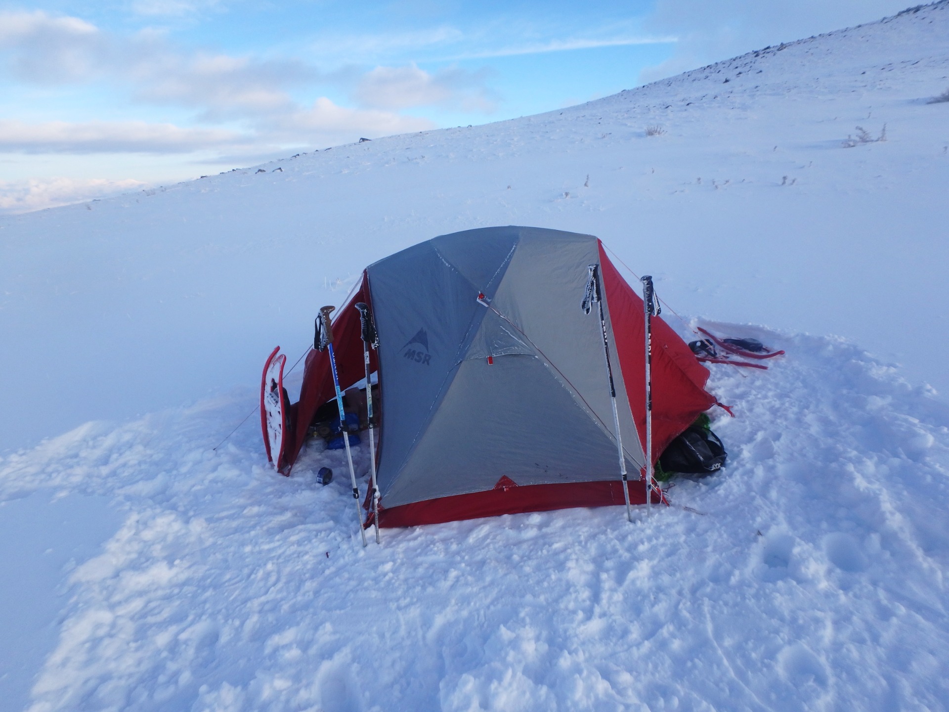 No nebylo, žejo. Bylo to sakra moc. Sníh začal po -1000 metrech (zhruba, trochu jsme po těch pivních v tom tágu vytuhli). Chceme dojít k jezeru, ale to nedáme ani za nic. Píchnem' to někde doprostřed ničeho skoro za tmy, hodinu vaříme sníh a já zjistím, že mi nefunguje károška. Na sněhu extra super. Batohy beru zavděk.